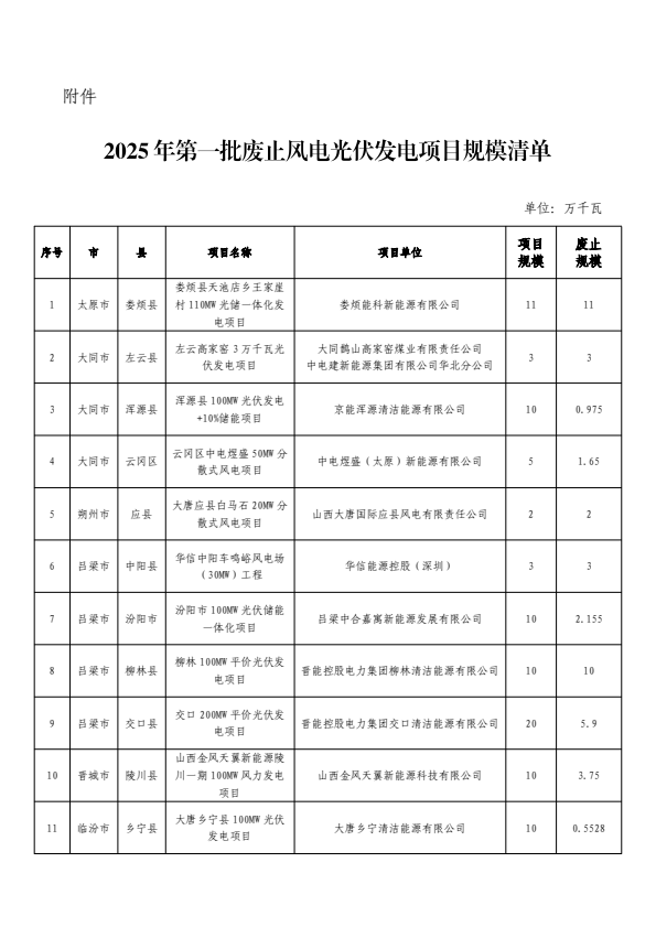 5月12日,山西能源局发布2025年第一批废止风电光伏项目规模清单通知: