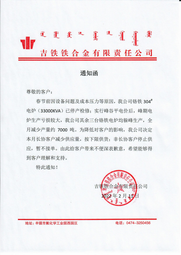 《铁合金在线》2022-2-11:吉铁铁合金关于铬铁停产检修的通知函